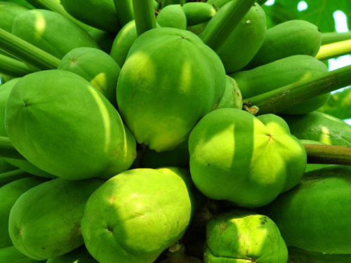 番木瓜(學(xué)名:Carica papayaL.)是番木瓜科、番木瓜屬植物。常綠軟木質(zhì)小喬木,高達(dá)可達(dá)10米,具乳汁;葉大,聚生于莖頂端,近盾形,葉柄中空,花單性或兩性,植株有雄株,雄花:排列成圓錐花序,下垂;花無(wú)梗;萼片基部連合;花冠乳黃色,冠管細(xì)管狀,雌花:?jiǎn)紊蛴蓴?shù)朵排列成傘房花序,著生葉腋內(nèi),花冠裂片分離,